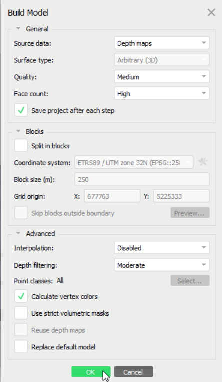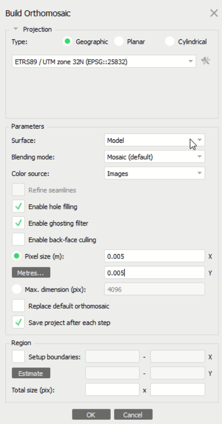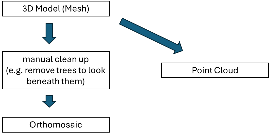 - For calculation the Orthophoto, we suggest calculating Mesh + clean the Mesh (eg. remove trees to get Orthophoto below trees). And then calculate Orthophoto based on this Mesh. Our suggested workflow for getting best results: